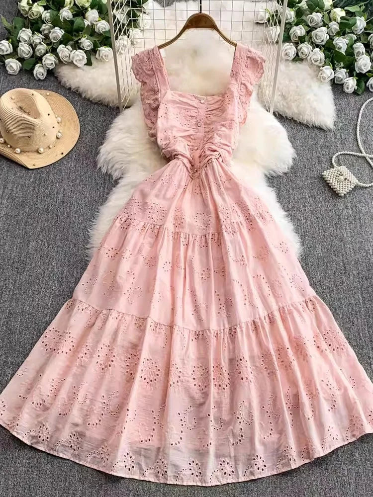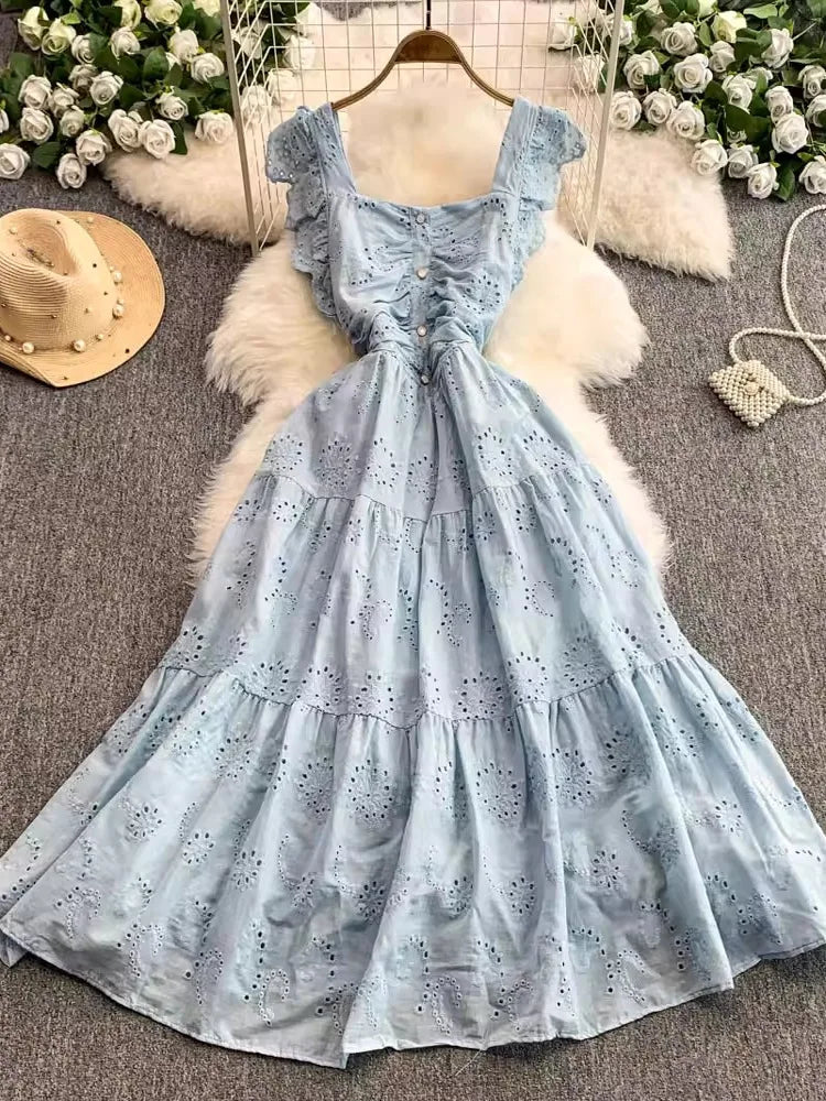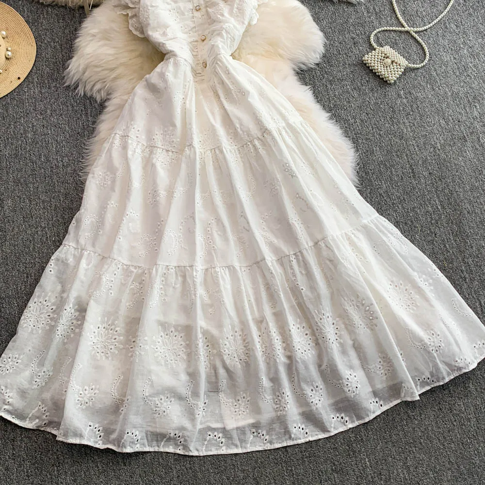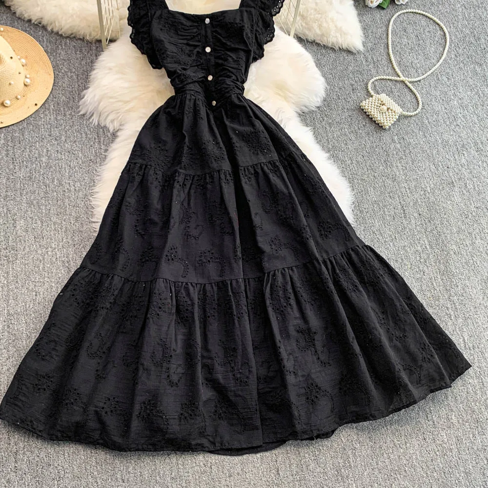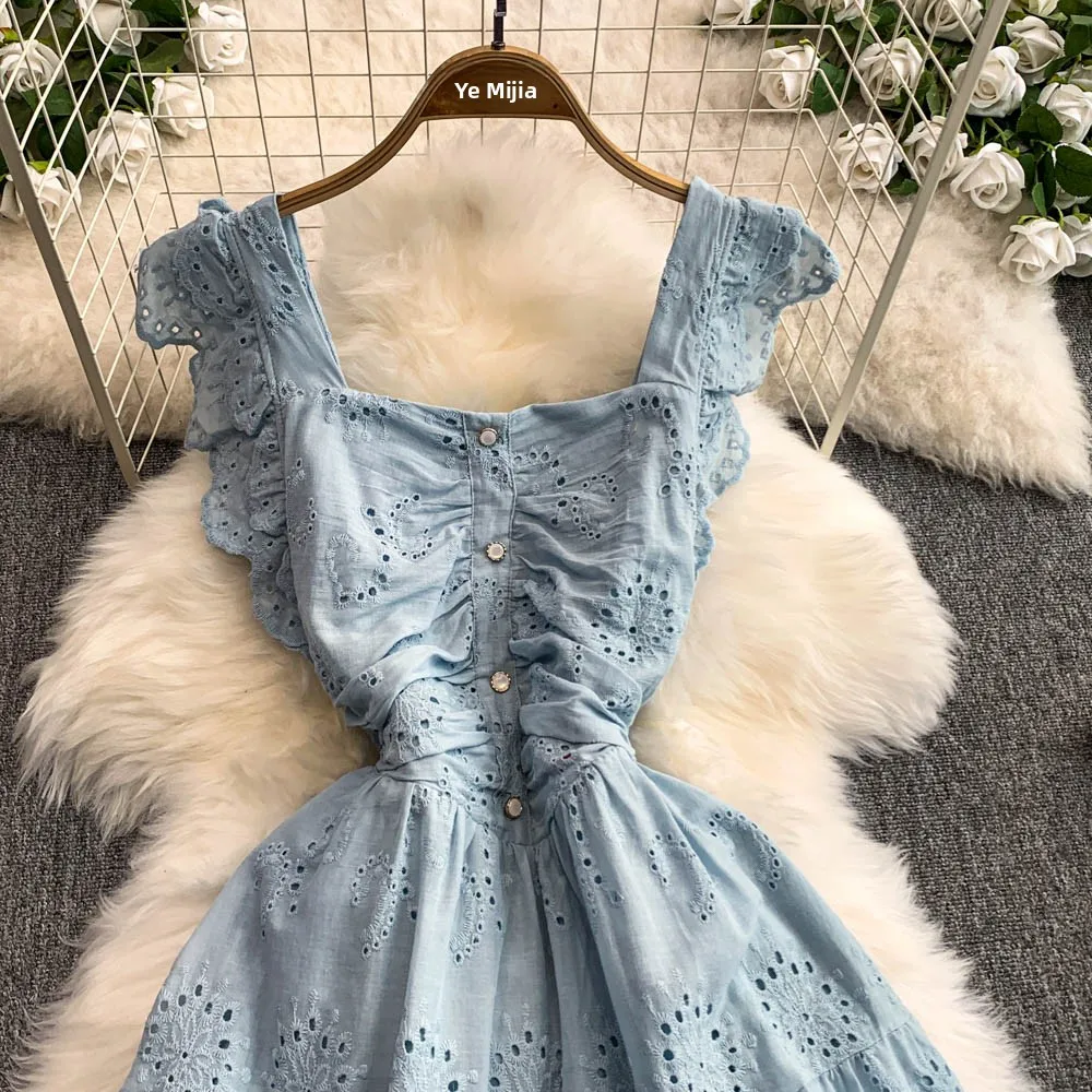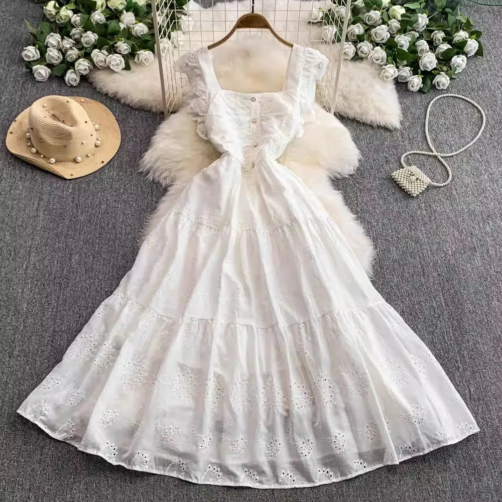 Ele Hollow out Embroidery Square Collar Dr Women Summer Faion High Waist Slimming Fairy Long Dr Vaion Sle