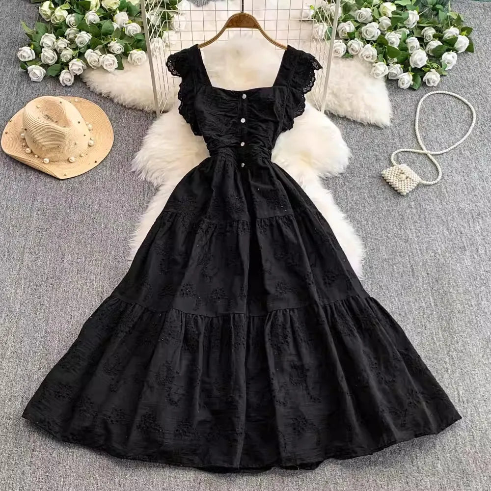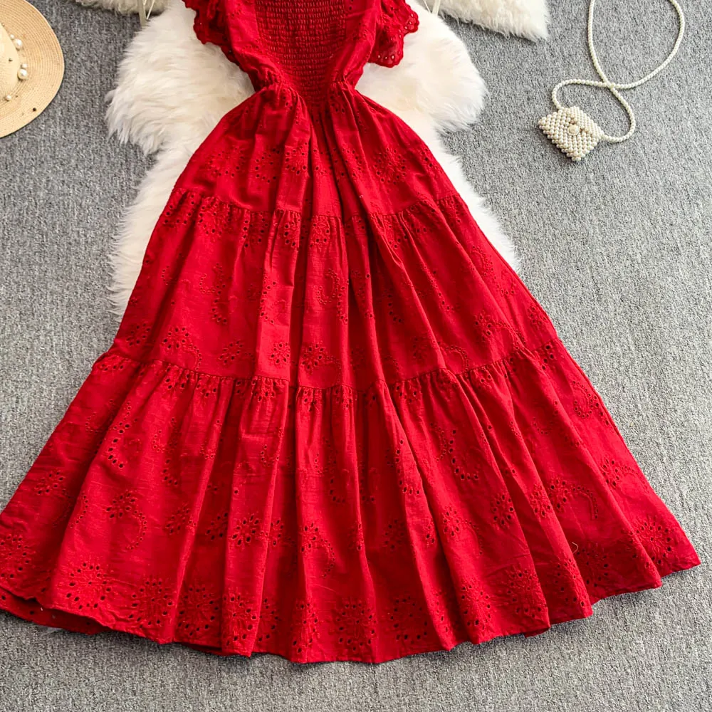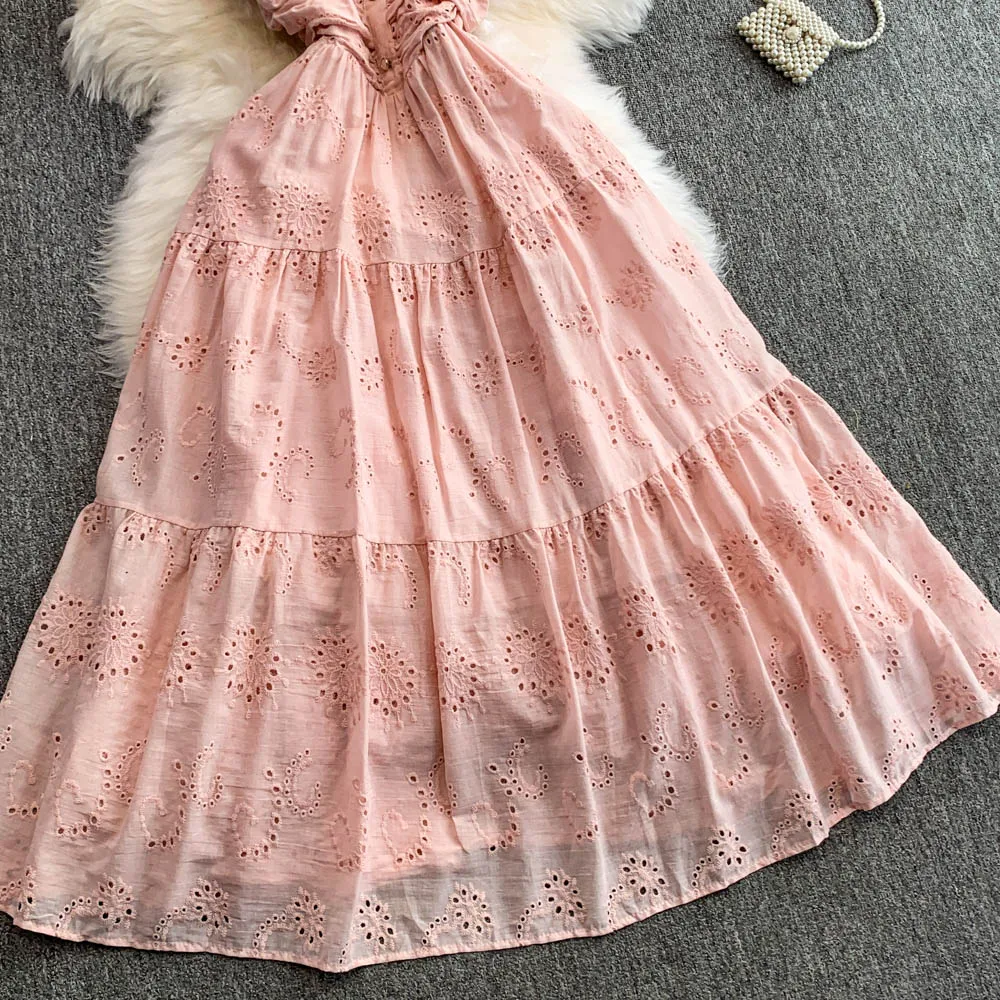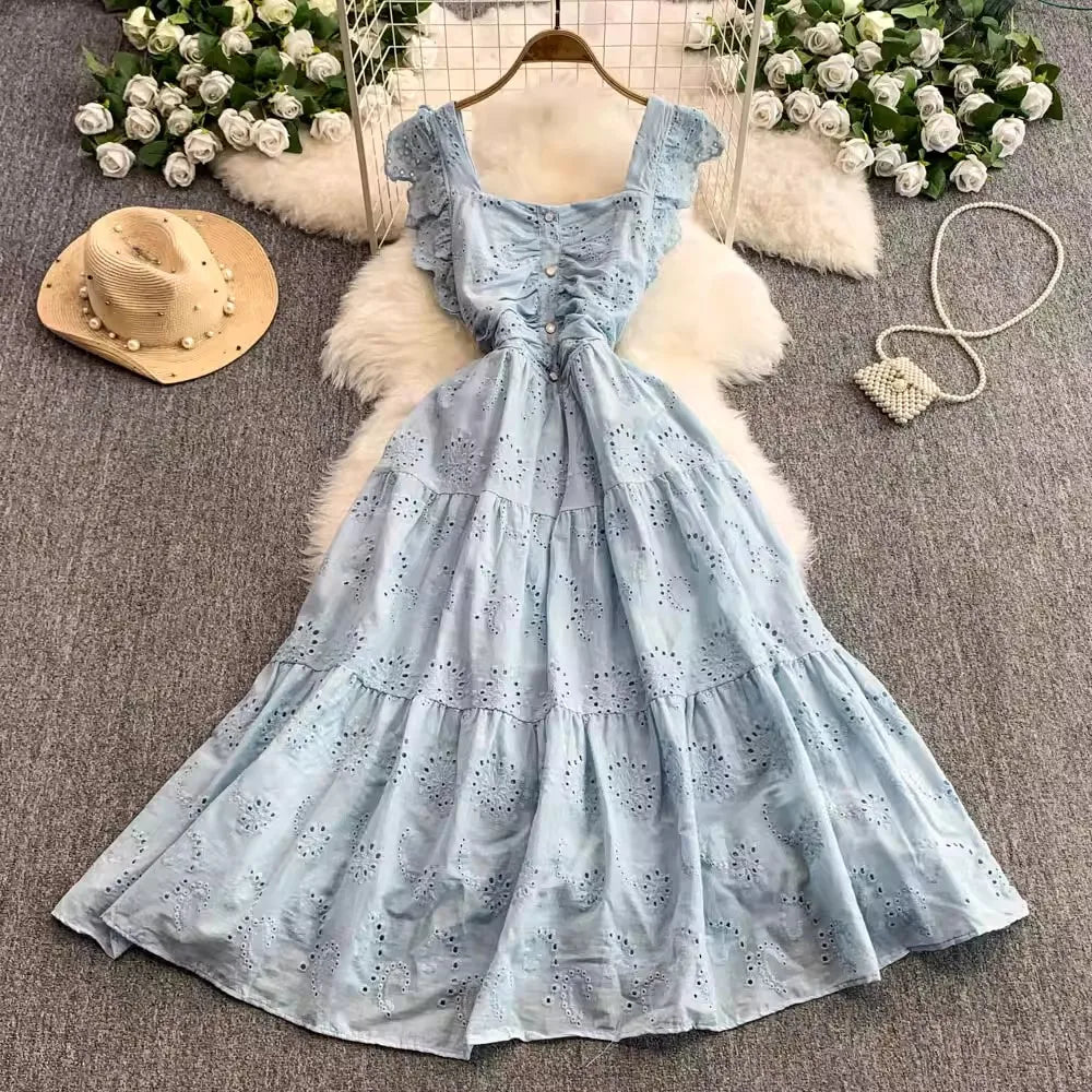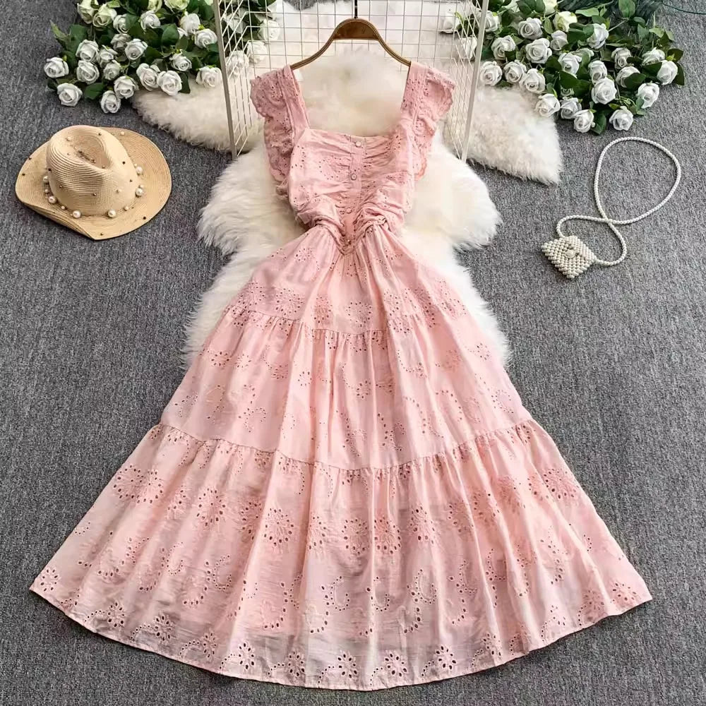 Ele Hollow out Embroidery Square Collar Dr Women Summer Faion High Waist Slimming Fairy Long Dr Vaion Sle