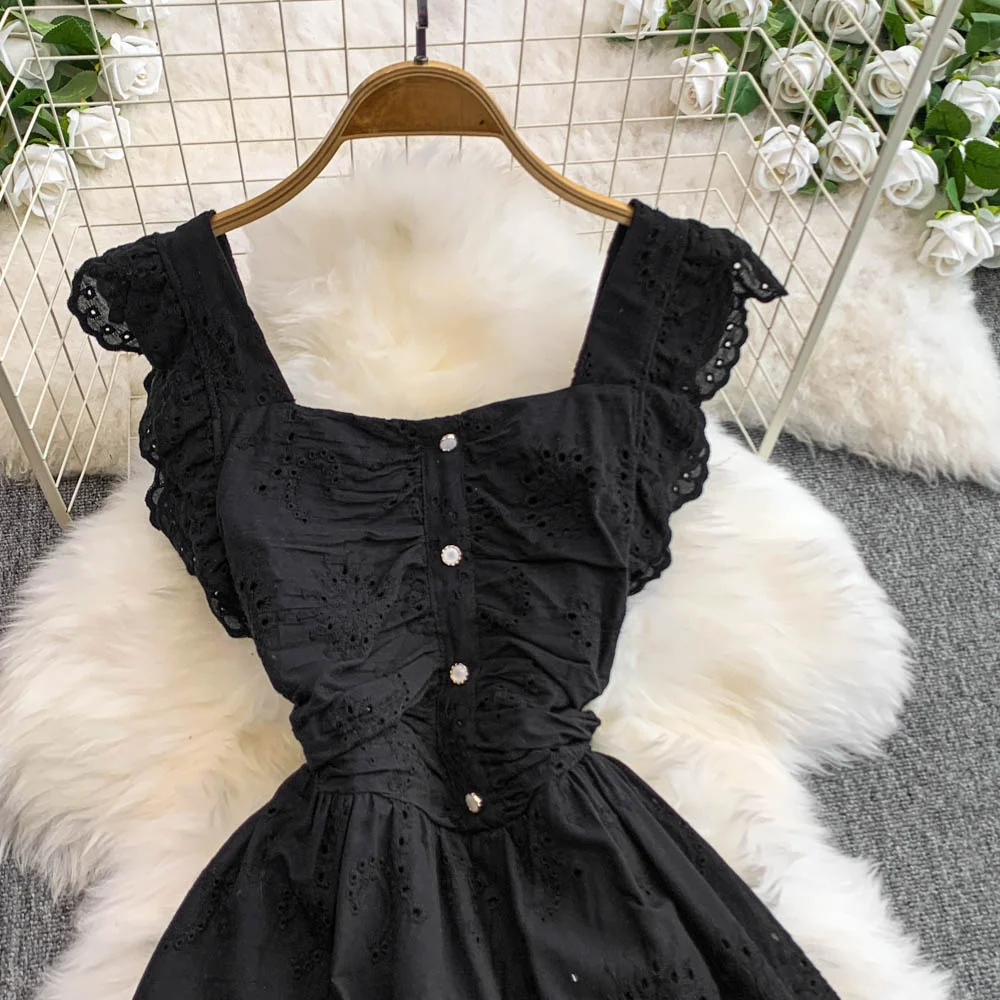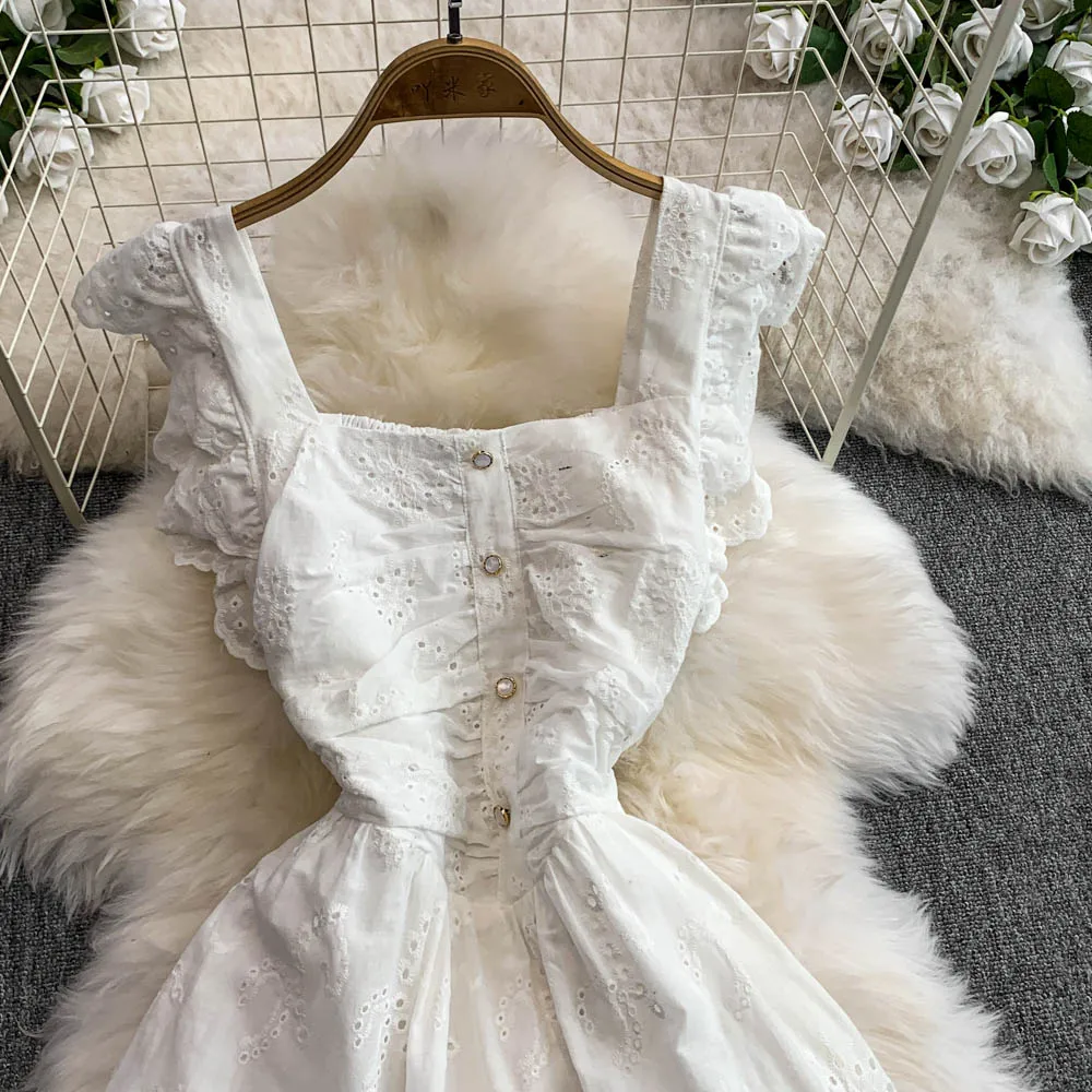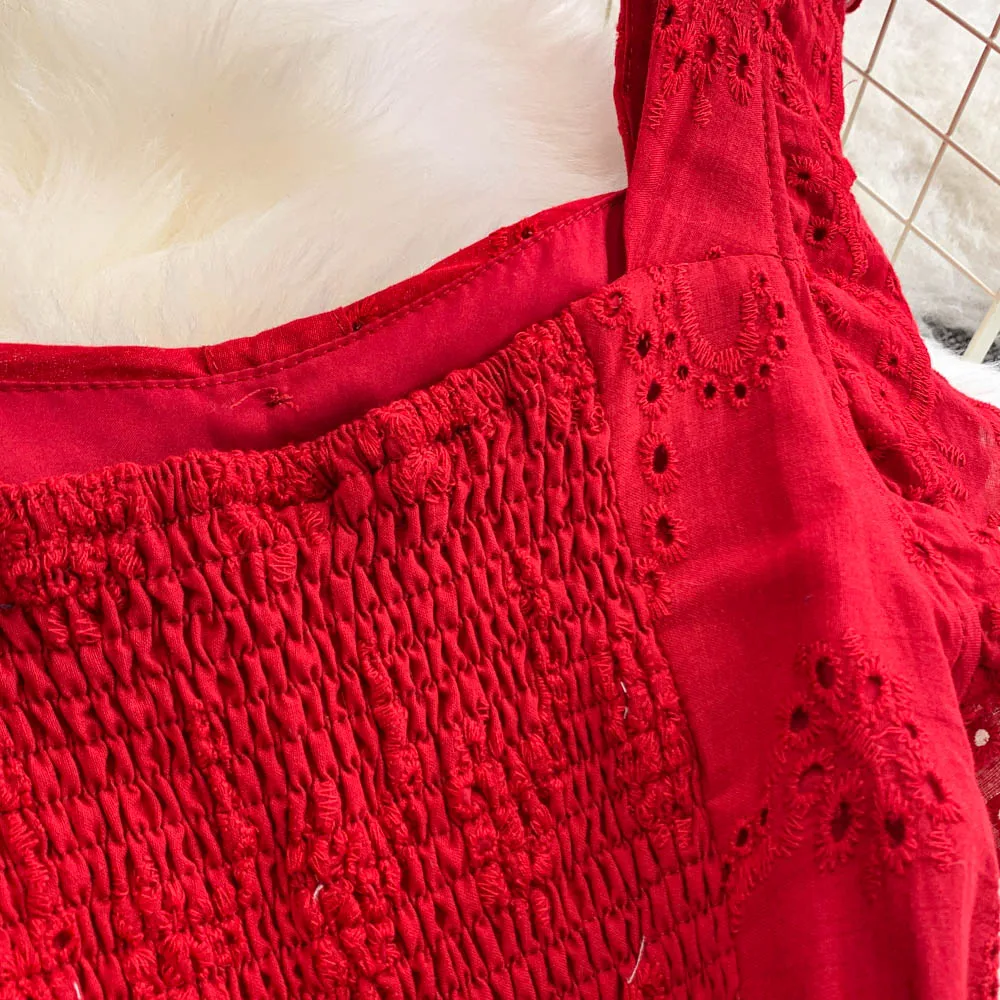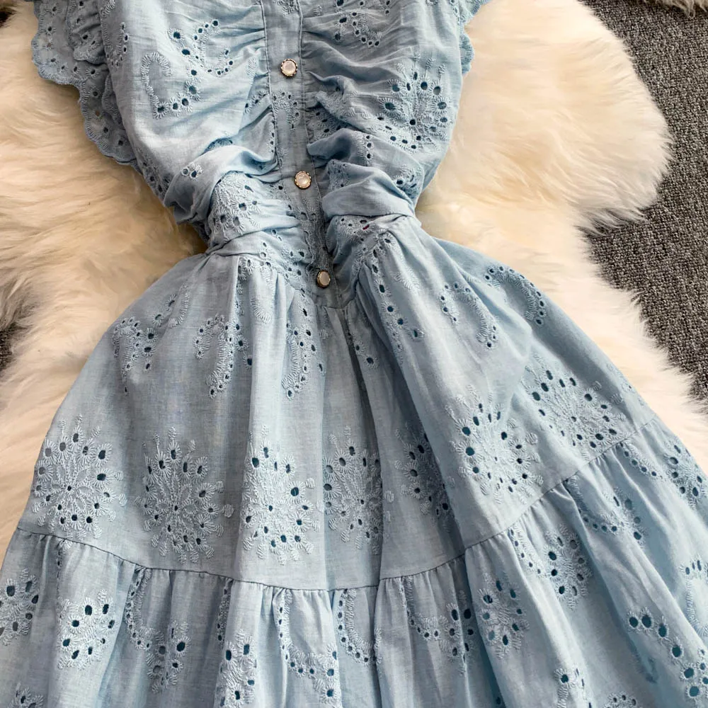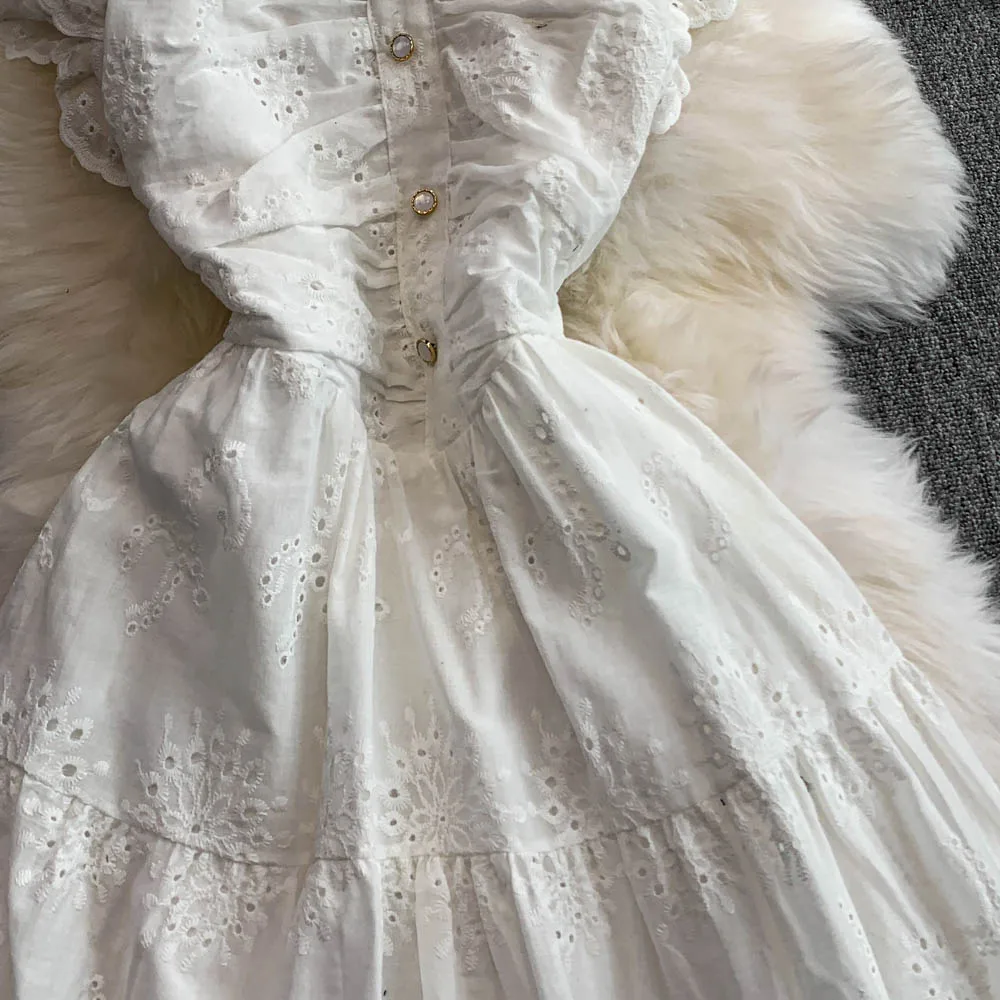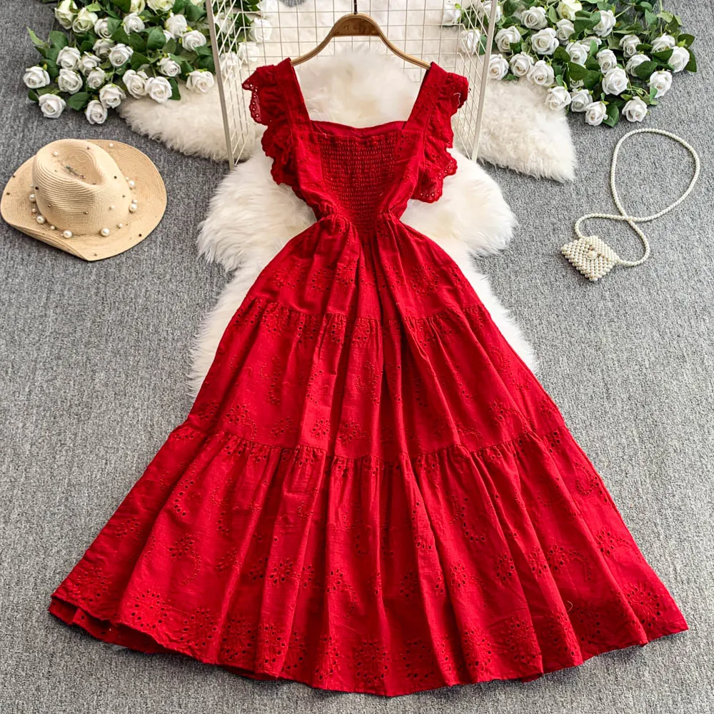 Ele Hollow out Embroidery Square Collar Dr Women Summer Faion High Waist Slimming Fairy Long Dr Vaion Sle