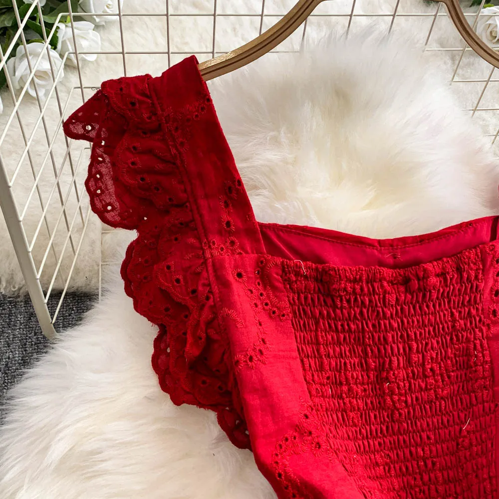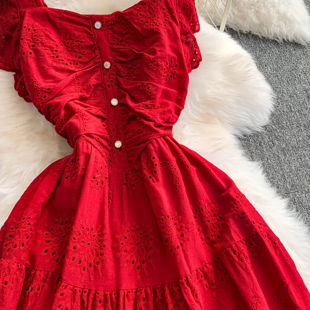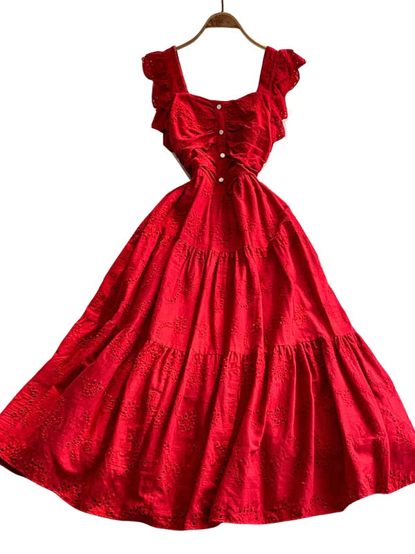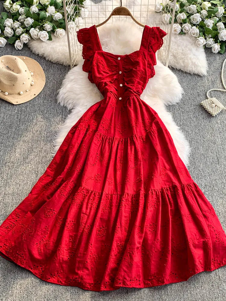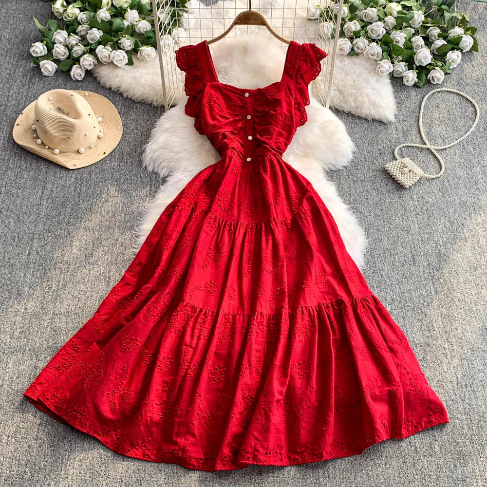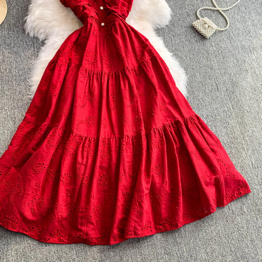 Ele Hollow out Embroidery Square Collar Dr Women Summer Faion High Waist Slimming Fairy Long Dr Vaion Sle