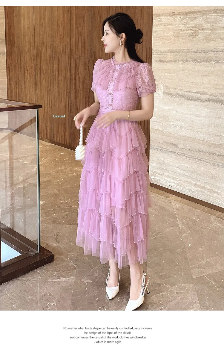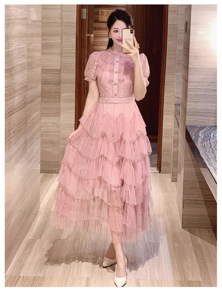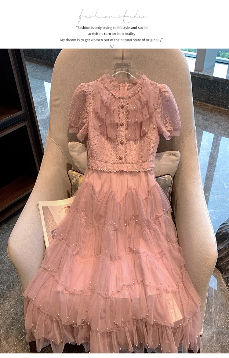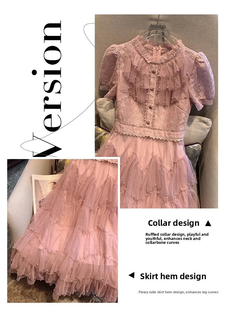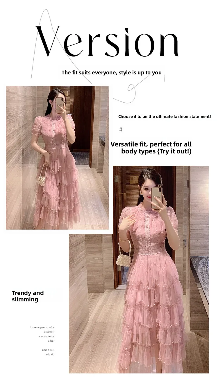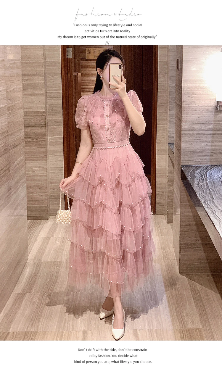 Embrace elegance with this pink beaded dress, featuring a charming French-inspired design that exudes sweetness and grace.