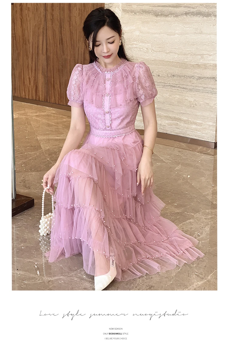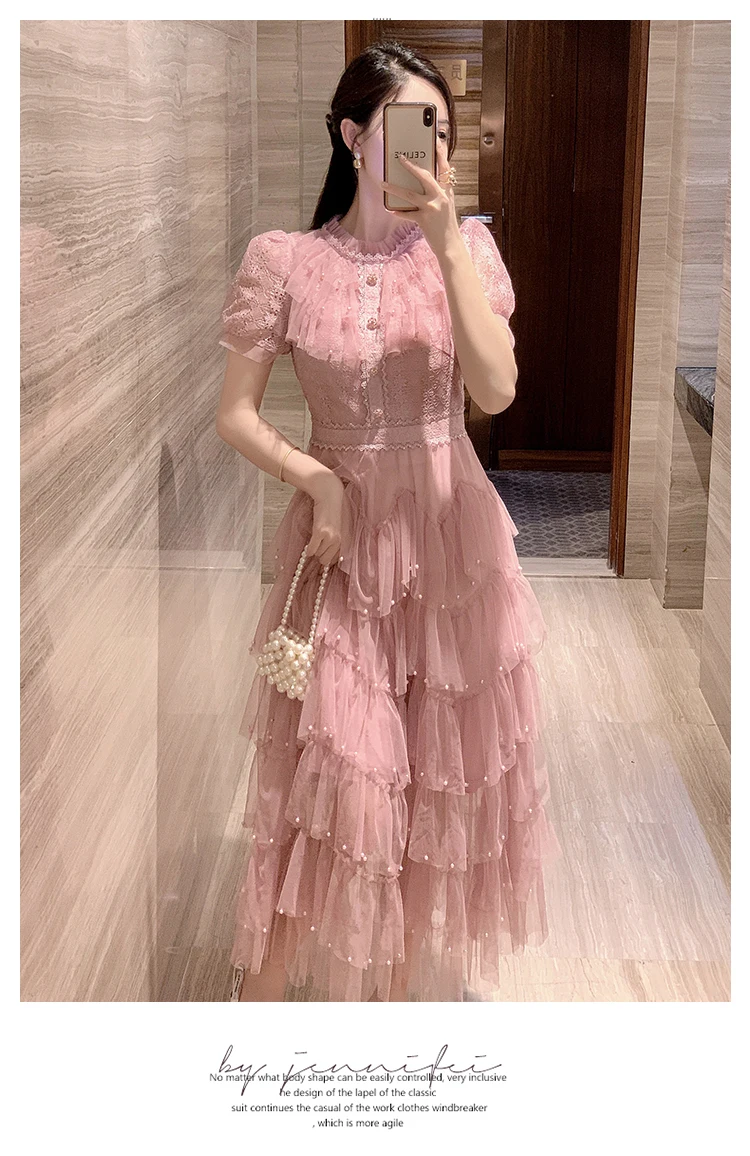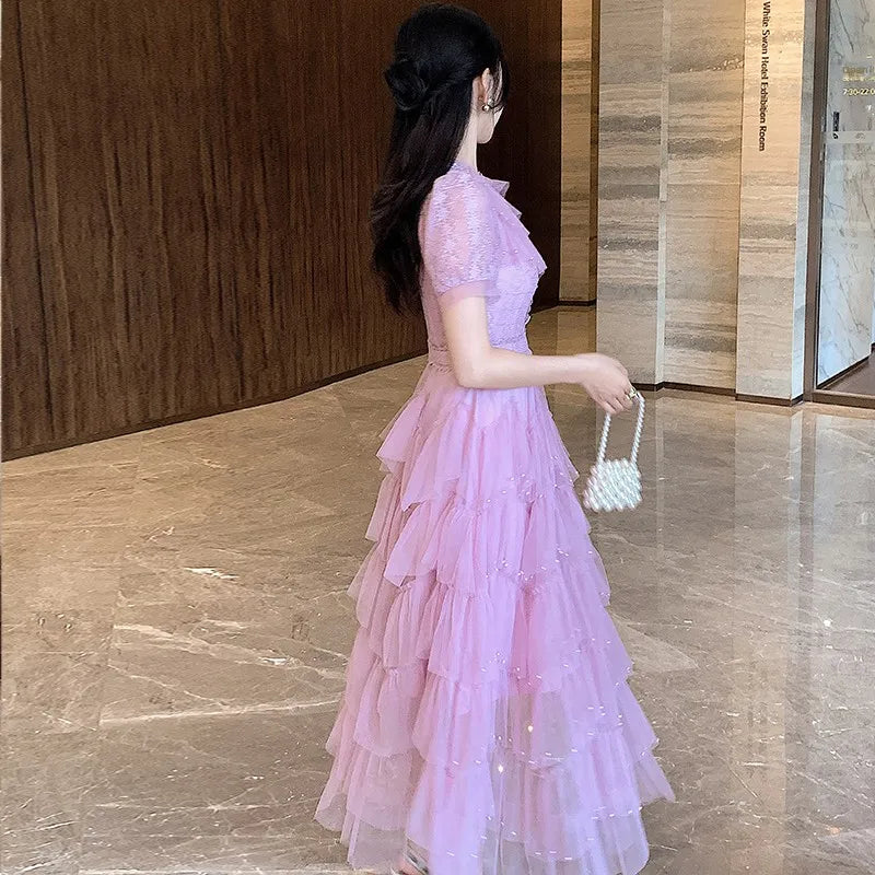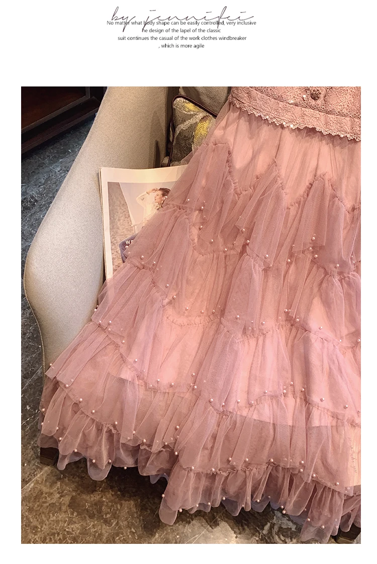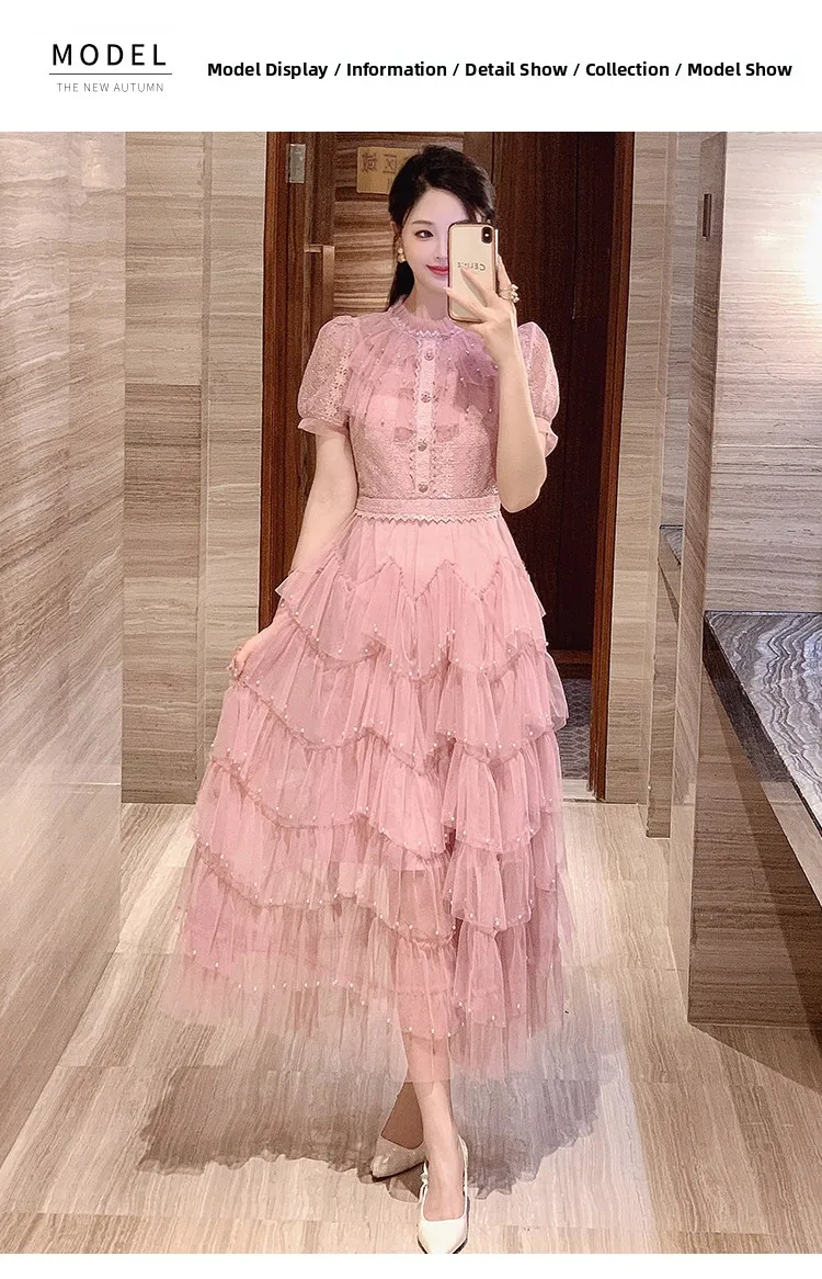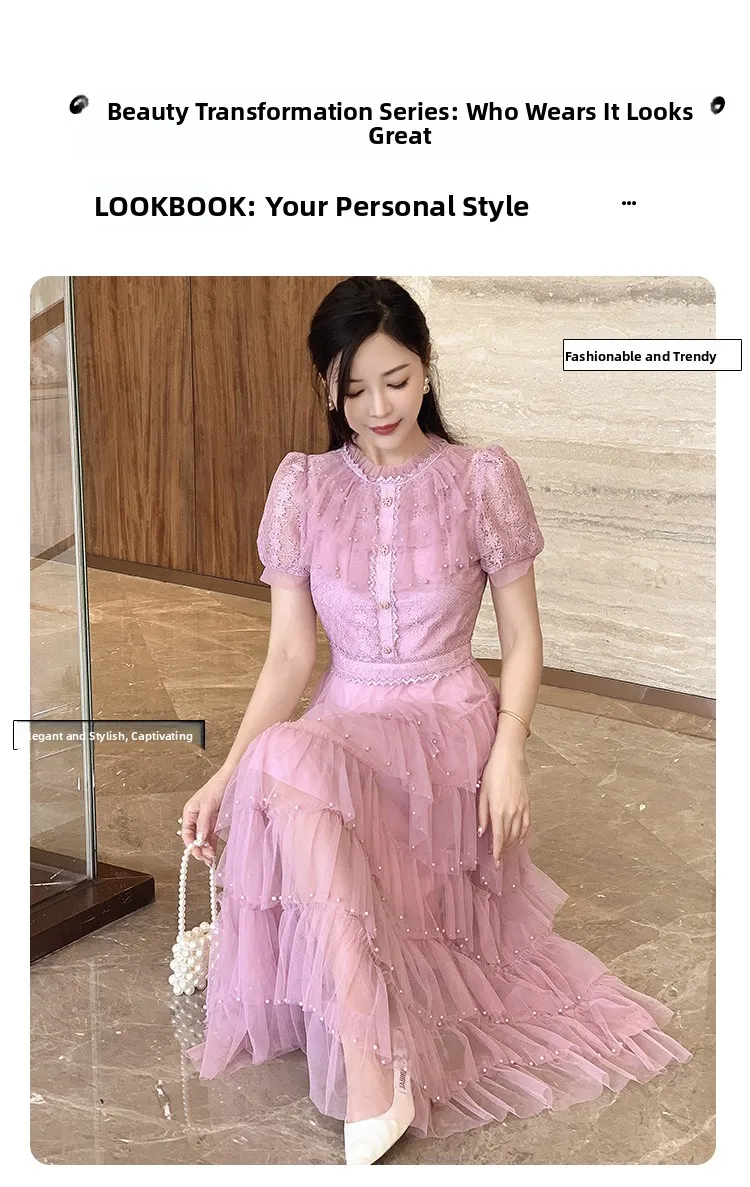 Embrace elegance with this pink beaded dress, featuring a charming French-inspired design that exudes sweetness and grace.