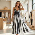 The Monochrome Grace Maxi Dress is designed for women who appreciate clean lines, comfort and understated style. Featuring a geometric monochrome pattern and a subtle asymmetrical detail, this dress offers an elegant yet relaxed look for warm summer days.
