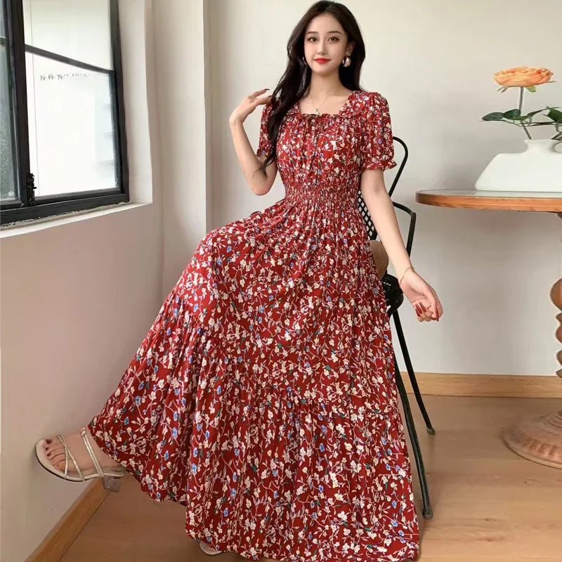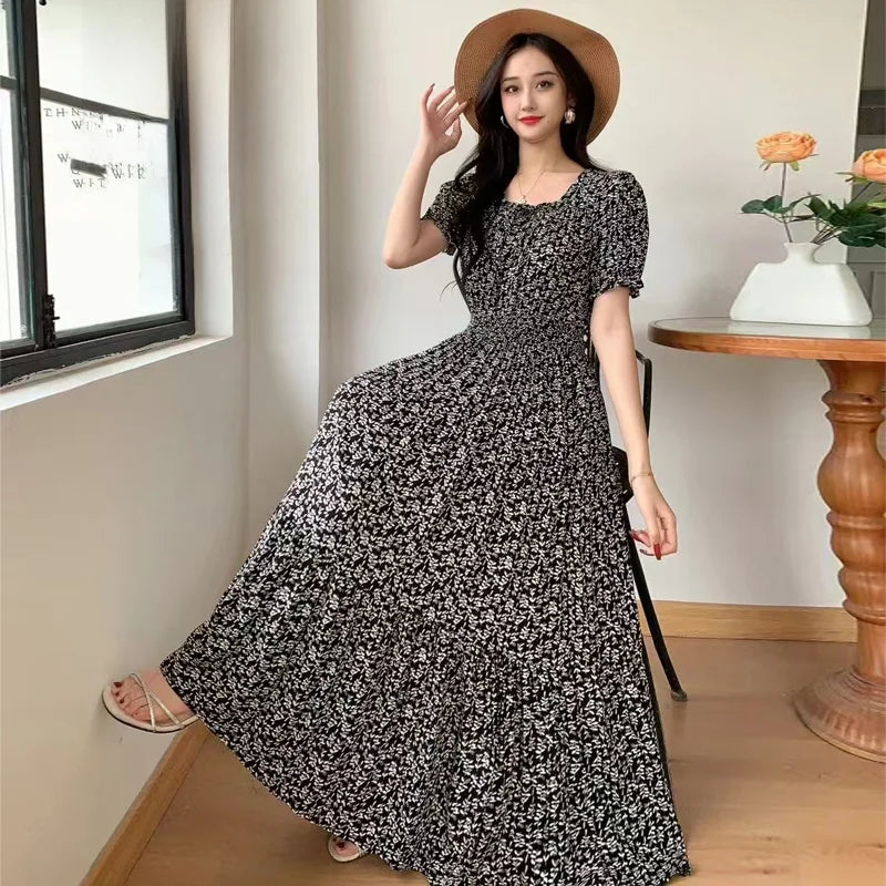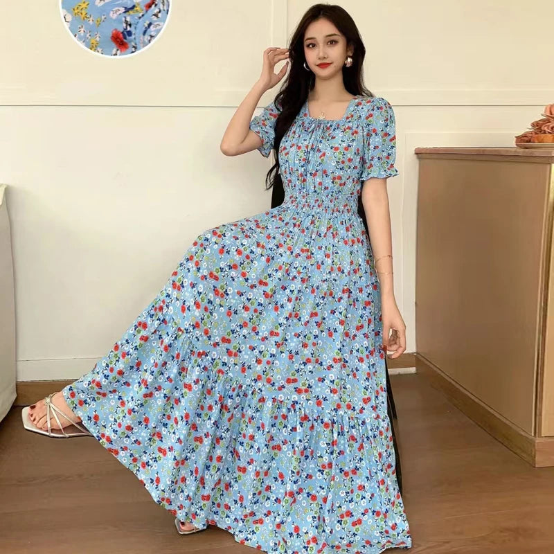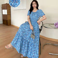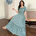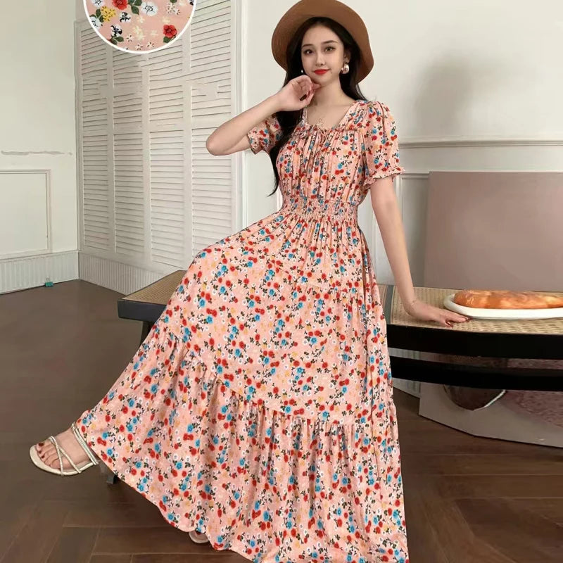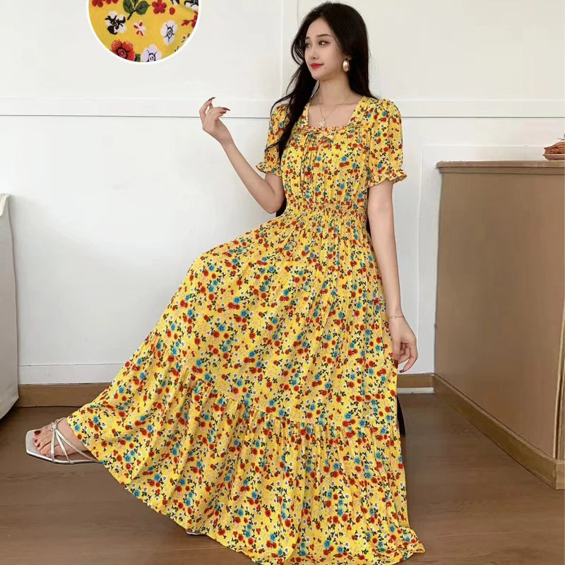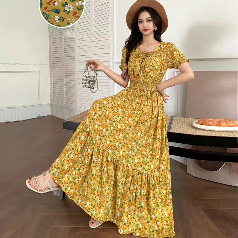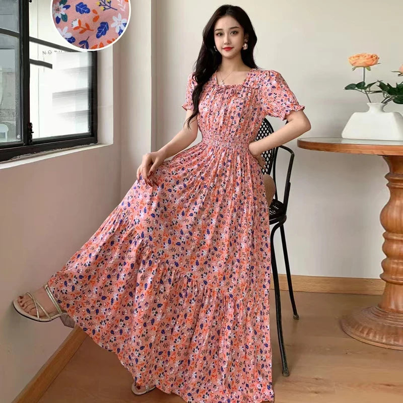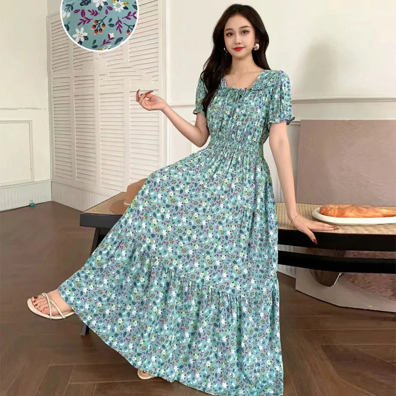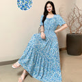 Summer New Cotton Silk Floral Print ort Sve Dr Young People Beach Midi Skirt High Waist A-Line Gown Soft Cotton Fabric