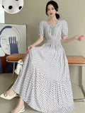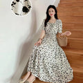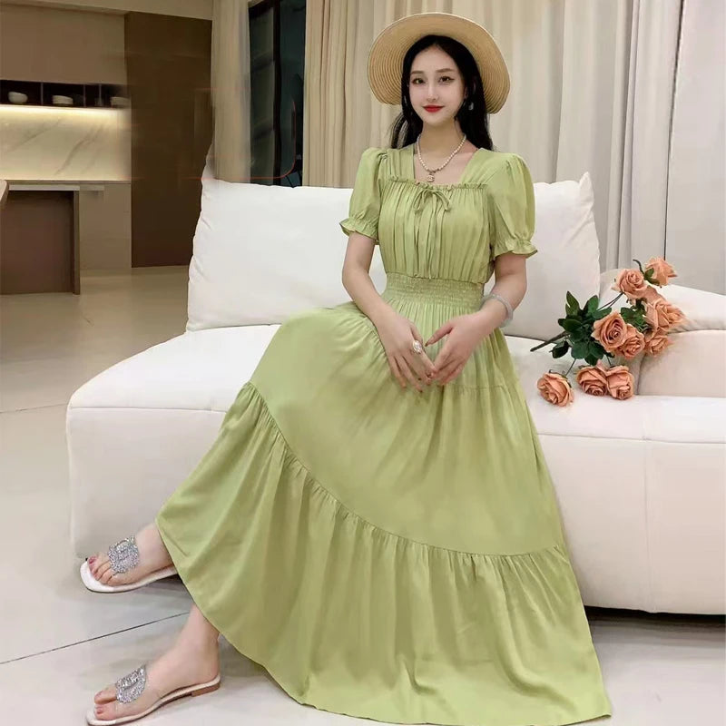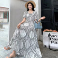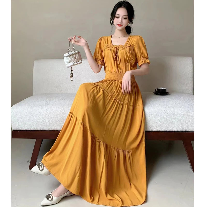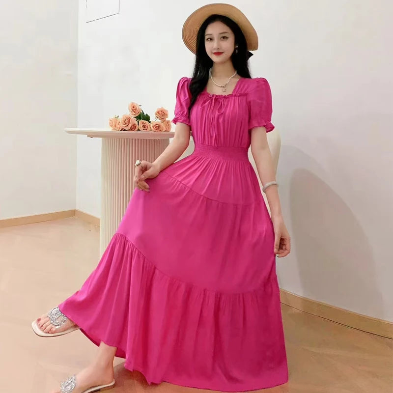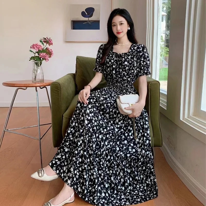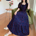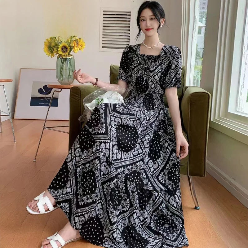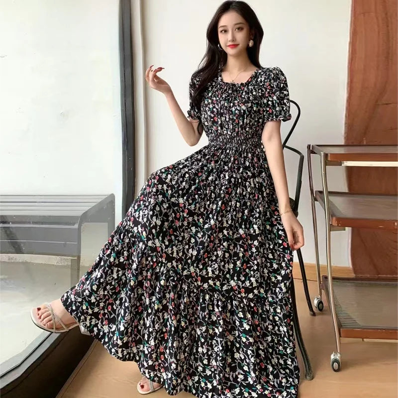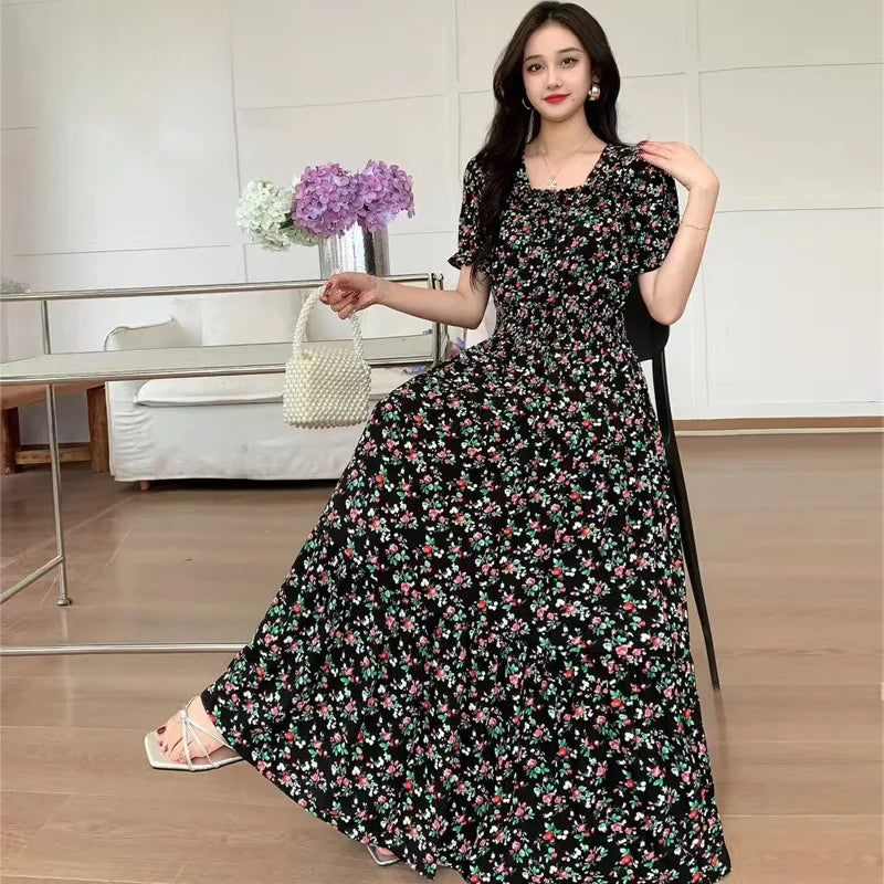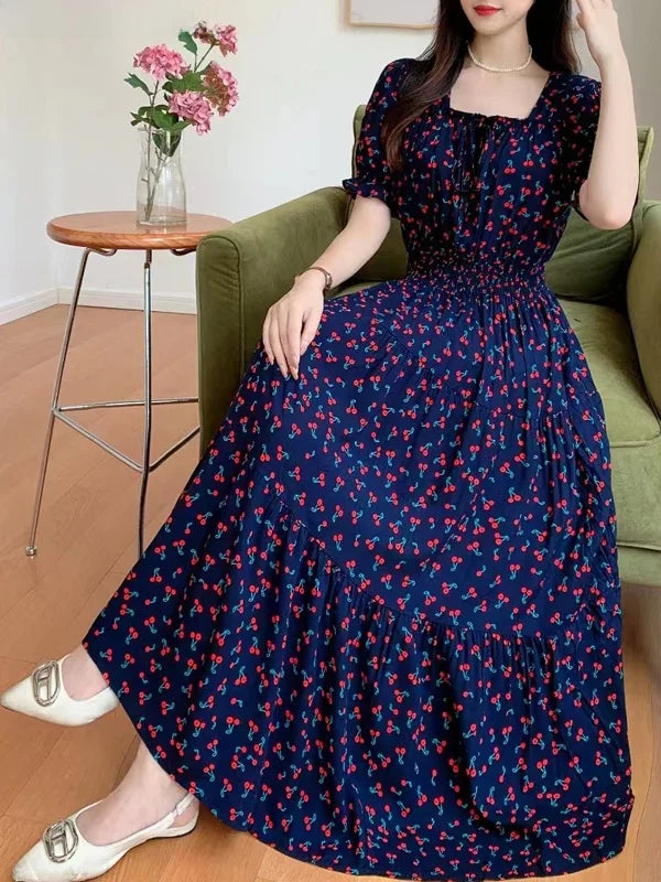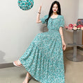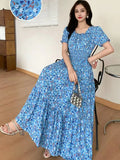 Summer New Cotton Silk Floral Print ort Sve Dr Young People Beach Midi Skirt High Waist A-Line Gown Soft Cotton Fabric